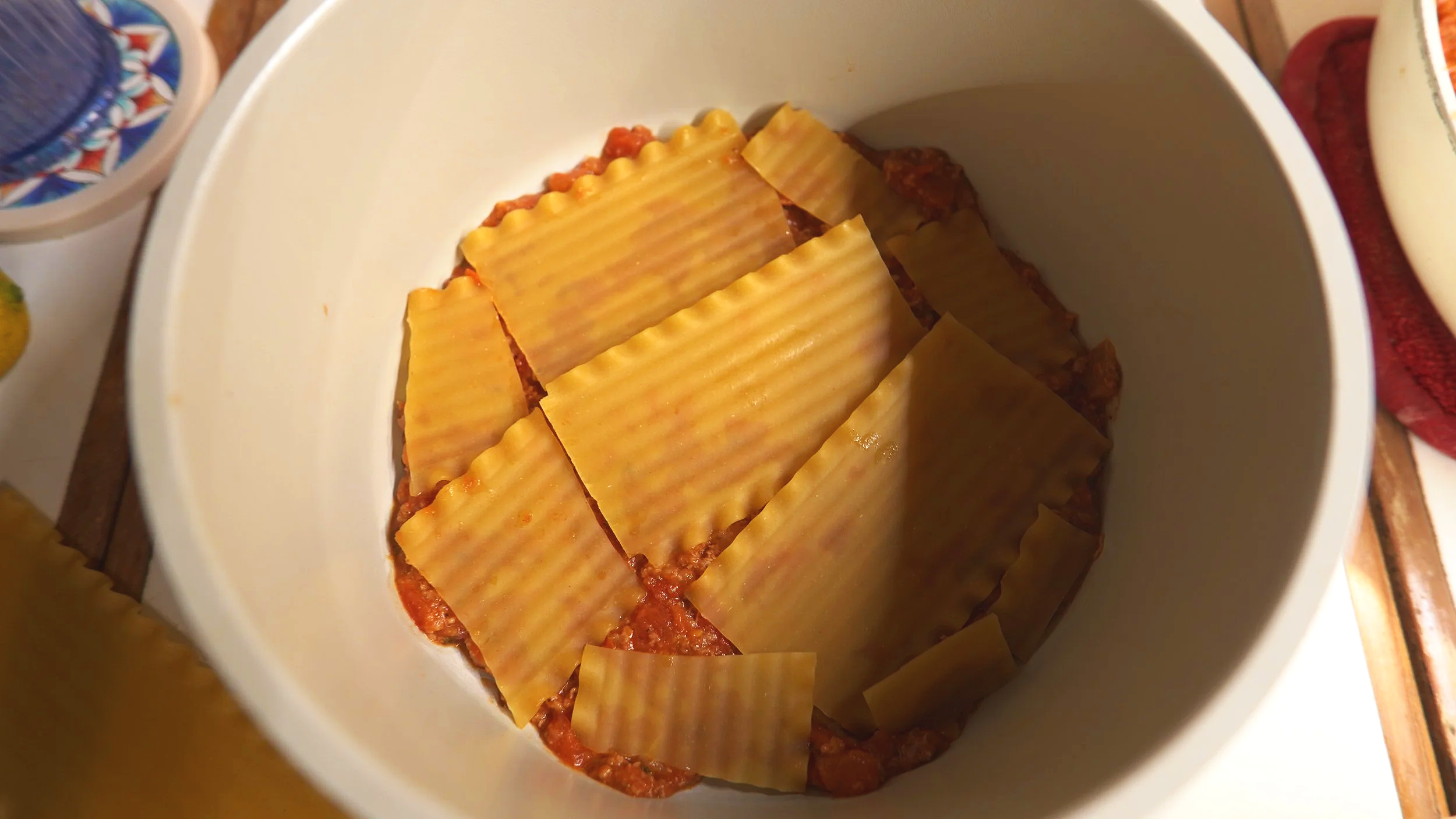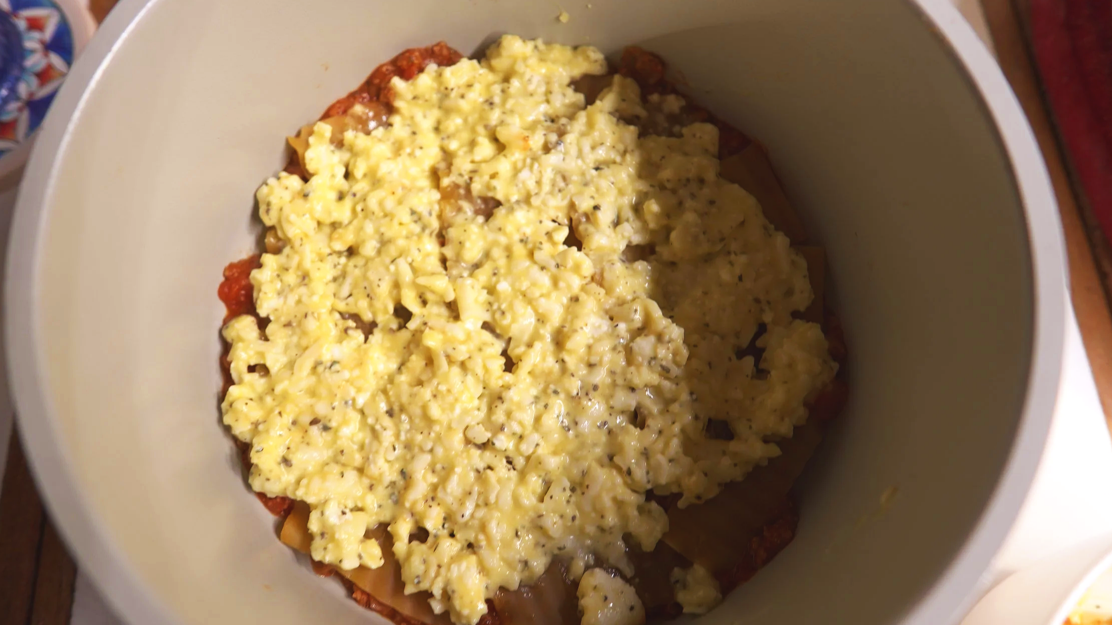 Layer 3 lasagna noodles. If you are using the same pot, you may need to break the noodles to fit the circular pot.