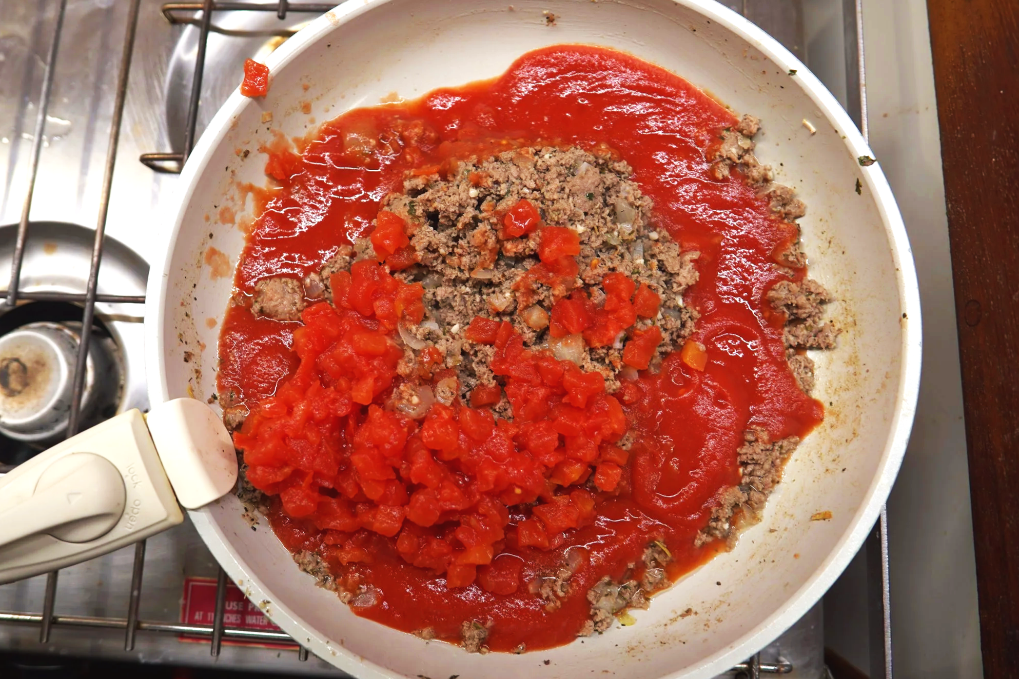 Set heat to simmer and add diced tomatoes and tomato sauce. Optional If sauce seems runny after simmering, slowly add flour until thickened.