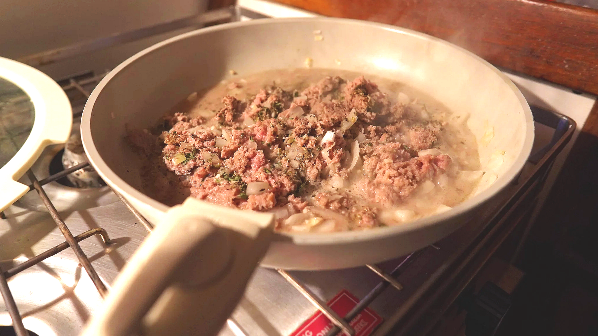 While ground turkey is simmering, mix cream cheese, mozzarella, eggs, and seasonings in a small bowl.